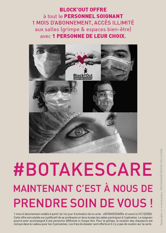 L'agence de la Vallée est très fière de relayer une campagne nationale initiée par Block'Out (https://www.blockout.fr/). A partir du 6 juillet 2020, avec la carte BOTAKESCARE, le personnel soignant aura droit, durant un mois et avec l'accompagnant de son choi (...)