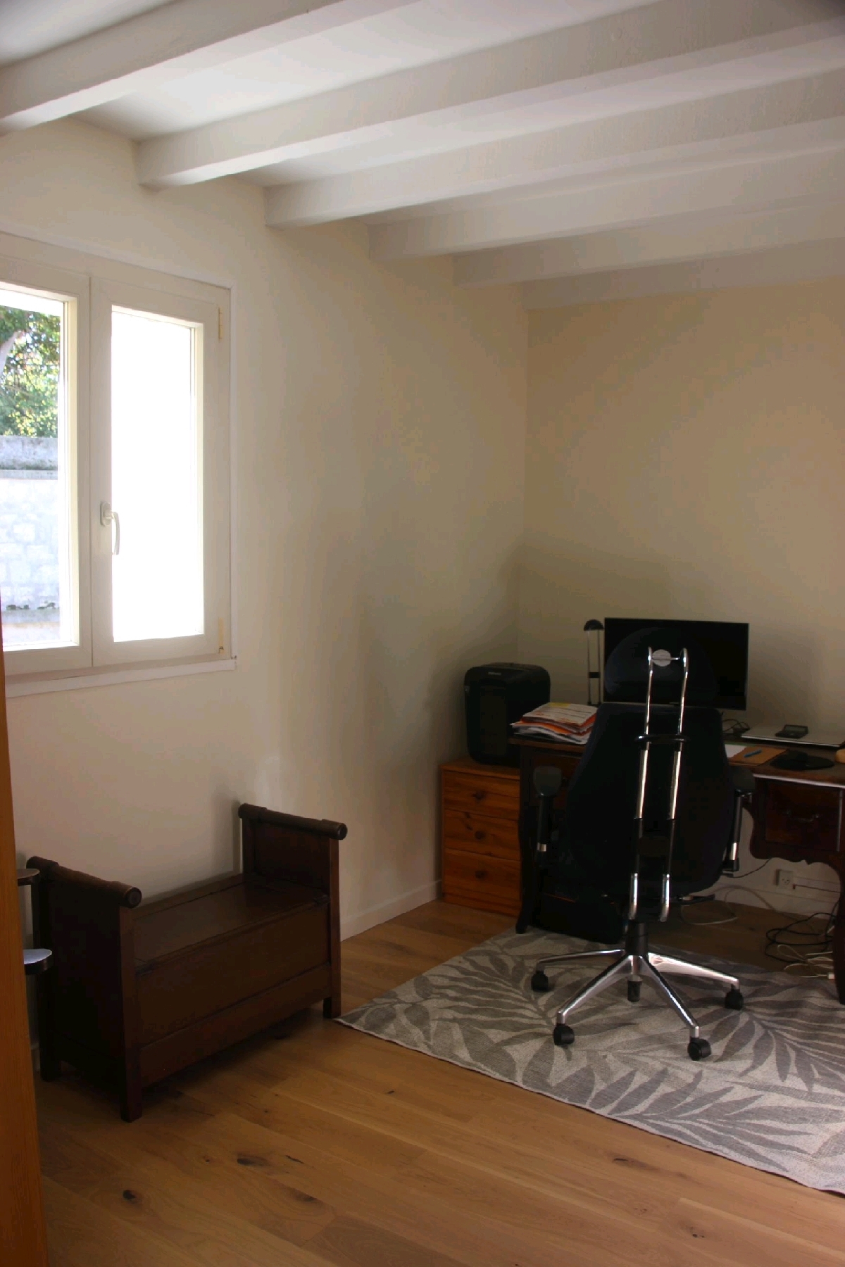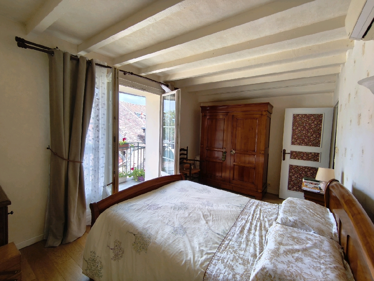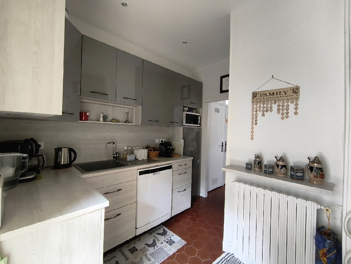 Le rez-de-chaussée s’ouvre sur une entrée avec WC, cuisine aménagée indépendante et ouverte sur la terrasse et le jardin. Le séjour lumineux haut de plafond, avec ses poutres et tomettes est agrémenté dune cheminée à insert, pour des soirée conviviale et chaleureuse.