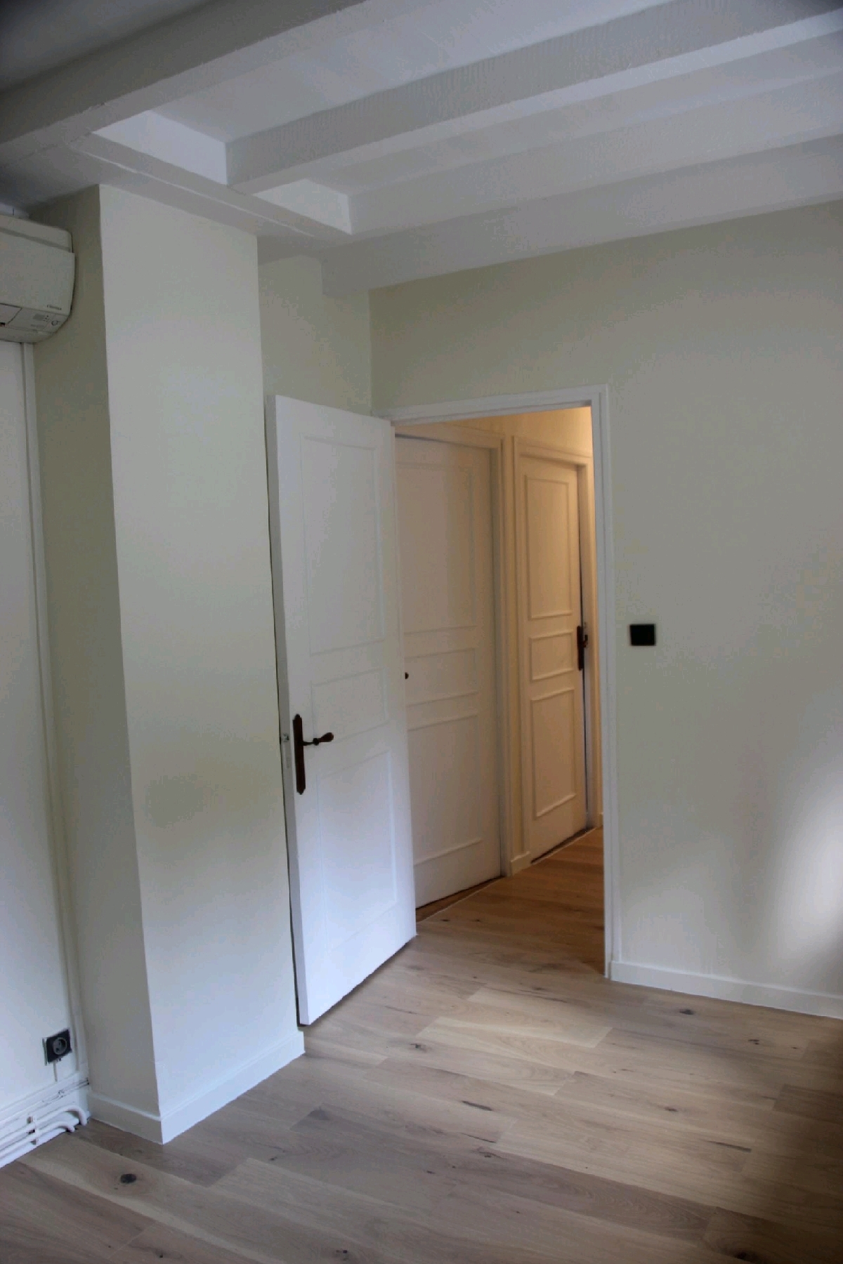 À létage : Un couloir dessert trois chambres spacieuses, dont une avec balcon, une salle deau avec toilettes.